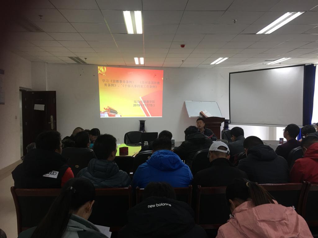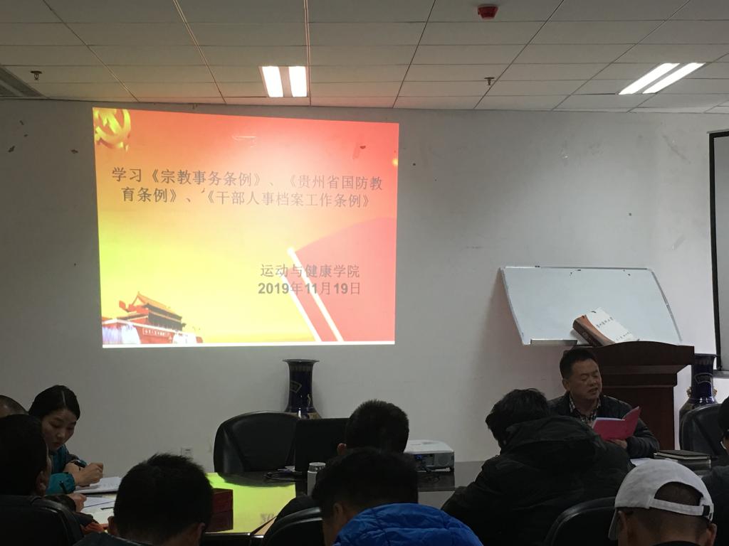 11月19日中午,公司在体育馆三楼会议室召开了全体教职工学习会议,学习的内容为《宗教事务条例》、《贵州省国防教育条例》、《干部人事档案工作条例》,会议由姚思勤书记主持。