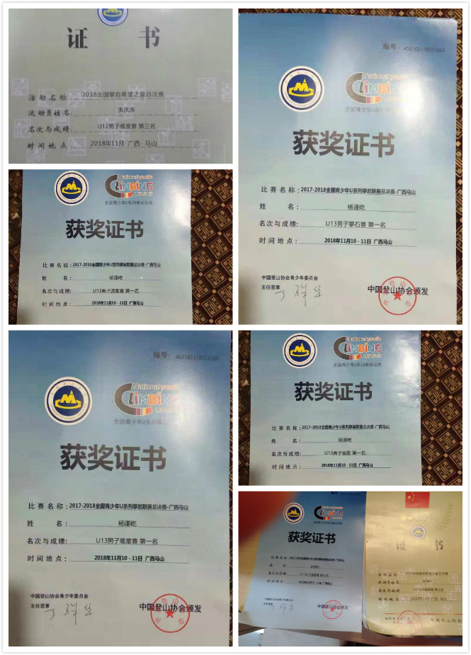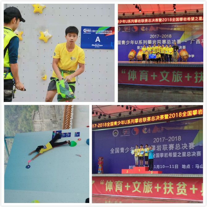 11月9日,全国青少年U系列攀岩联赛总决赛暨2018全国攀岩希望之星总决赛在广西马山举行,此次公司国家攀岩集训队(贵州)共派出9名小队员参赛。运动员杨谨屹一路过关斩将,通过激烈拼搏,打破全国青少年速度标准道全国纪录,为学校争得了荣誉。