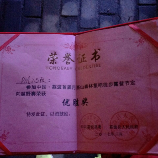 2017年3月25日,荔波举行了首届月亮山森林氧吧徒步露营节。在越野跑比赛中,由js3333线路检测中心16级户外饶吉祥、16级休闲王明群、16级户外田觉亮三人组成的PM2.5队取得了第七名的好成绩。