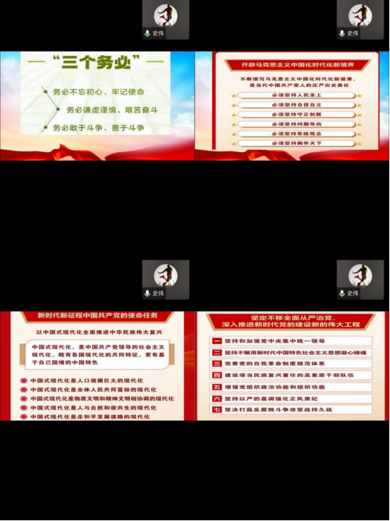 10月27日,教工第一党支部通过腾讯会议的方式开展了“学习宣传贯彻党的二十大精神”专题党课,支部全体党员参加会议,支部书记史伟主持会议。