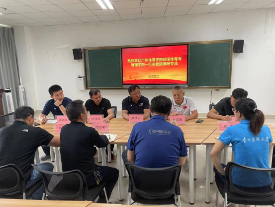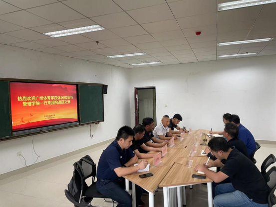 廖雄忠对学院在体育学科及专业建设和发展取得的成绩给予了高度赞许,并希望两家单位就专业建设、人才培养、发展规划以及相互合作开展进一步的交流。广州体育学院翁家银、崔洪成、叶祥财在调研交流环节热情发言,就校企合作、人才培养、专业特色建设与发展方面进行了研讨交流。